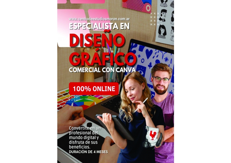 DISEÑO GRAFICO COMERCIAL *ONLINE*1. Introducción al diseño gráfico: historia, tendencias y campos de aplicación2. Elementos visuales: línea, forma, textura, color y espacio3. Psicología del color y su uso en la comunicación visual4. Tipografía: tipos, armonía y legibilidad5. Creación de logos:1. Interfaz de *Canva* y organización de proyectos2. Uso de plantillas: selección, edición y personalización3. Trabajo con imágenes, iconos y vectores4. Colores, fuentes y estilos5. Concepto de marca6. manual de identidad visual 1. Principios de diseño publicitario2. Análisis del público objetivo3. Diseño de anuncios para campañas digitales (Google, Meta Ads, etc.)4. Creación de marca personal1. Creación de marca general/trabajo final